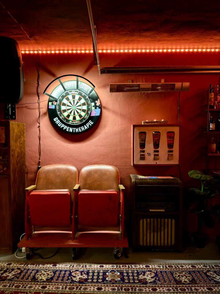 Zu einer gelungenen GRUPPENTHERAPIE gehört eine besondere Wohlfühlatmosphäre mit kalten Getränken in der eigenen THERAPIERBAR, die neben einer Snack-Vitrine auch einen originalen Kaugummiautomaten, eine Dartscheibe und einen Kicker bietet.